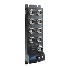 The EKI-2528I-M12 from Advantech is an unmanaged switch dedicated to industrial solutions. The module is equipped with 8 Fast Ethernet ports on M12 connector. The power is a 12-48 VDC redundant input design. Switch has Power Polarity Reverse Protect and an Overload Current Resetable Fuse. EKI-2528I-M12 features a solid, compact metal housing that rates IP67 protection. The device complies with railroad standard EN 50155.