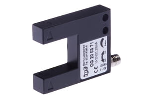 Special design of through-beam sensor. Transmitter and receiver are located in the fork or angular limbs and are perfectly aligned to each other.