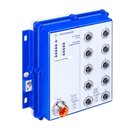 OS20-001000T5T5TNEUHB, 10 ports in total uplink ports: 10/100 BASE-TX, M12 "D"-coding, 4-pole 10 x 10/100 BASE-TX TP-cable, auto-crossing, auto-negotiation, auto-polarity., HIRSCHMANN