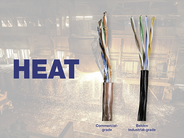 Laboratory simulations of extremely high temperatures clearly show how Commercial-grade cable performs vs. Belden Industrial-grade cable. Exposure to high ambient temperature or High UV levels degrades the cables, and can lead to breakdown of the jacket, followed by rapid degradation of the insulation materials. This reduces signal strength with Commercial-grade cables and can cause signal failure and reliability issues.