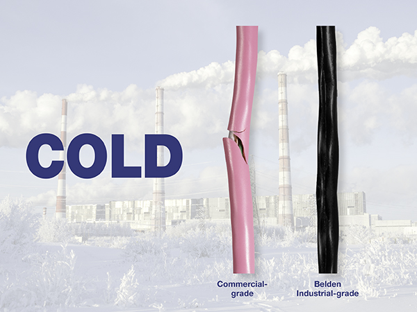 When tested for extreme low temperatures in a series of laboratory tests, Belden Industrial-grade cables clearly outperform Commercial-grade cables. Commercial-grade cables become brittle when exposed to cold temperatures. Damage typically occurs during flex, mechanical shock and/or impact.