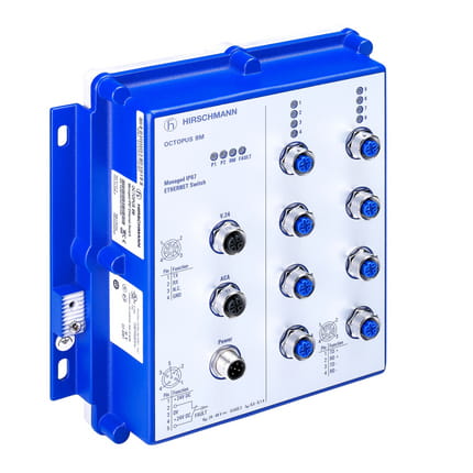 OCTOPUS 8M, 8 portów uplink: 10/100 BASE-TX, M12 kodowanie "D", 4 pin 8 x 10/100 BASE-TX kabel TP, auto-crossing, auto-negotiation, auto-polarity., HIRSCHMANN