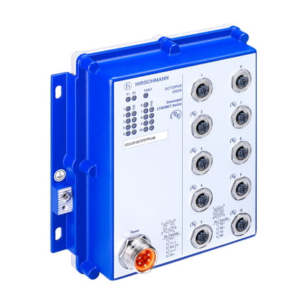 OS24-081000T5T5TFFUHB, 10 portów uplink: 10/100 BASE-TX, M12 kodowanie "D", 4 pin 10 x 10/100 BASE-TX, w tym 8 x 10/100 BASE-TX PoE (phantom power) kabel TP, auto-crossing, auto-negotiation, auto-polarity., HIRSCHMANN