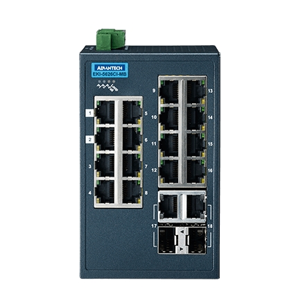 - 16 portów Fast Ethernet + 2 porty combo Gigabit Copper/SFP (EKI-5626C/CI-MB)
