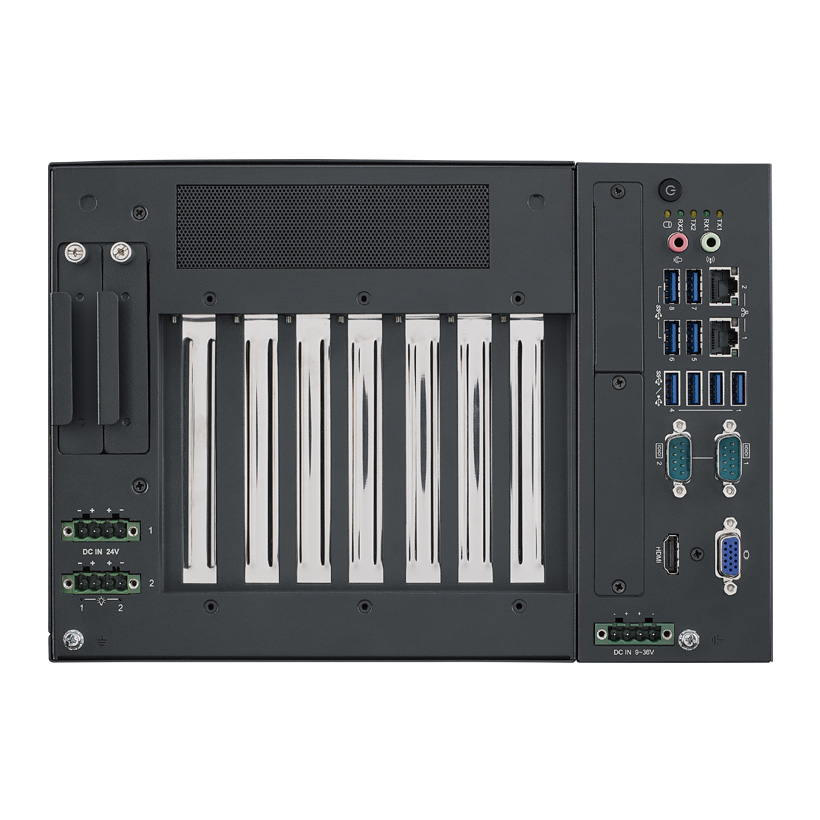 - Potrójne wejścia zasilania 24 VDC zapewniają niezależne zasilanie dla kart GPU i systemu MIC-7